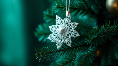 Snowflake ornament on Christmas tree, holiday decoration