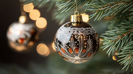 Two elegant Christmas ornaments dangle from a pine tree branch, enhanced by soft glowing lights in the background.