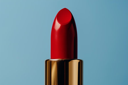 Closeup of an elegant red lipstick in a golden tube on a blue backdrop