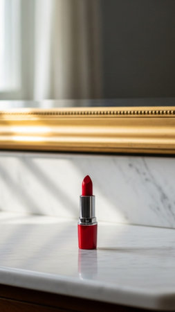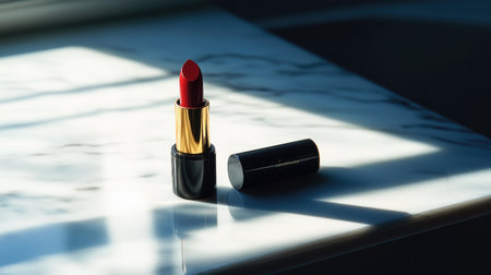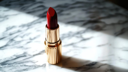 A striking red lipstick sits elegantly on a polished marble surface, creating a bold and stylish visual ideal for beauty promotions in the fashion industry.