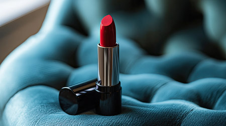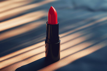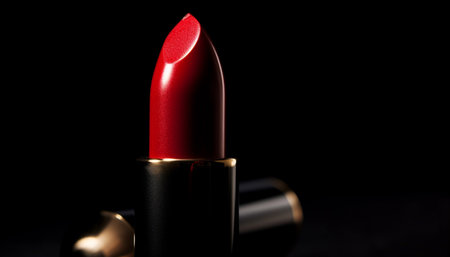 A stunning close-up of a sleek red lipstick placed elegantly against a dark background, capturing the essence of beauty and glamour with a hint of luxury.