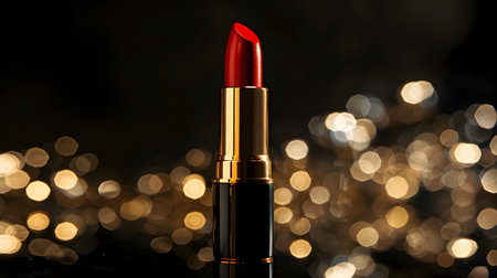 Luxury red lipstick on glittery golden surface glamorous lighting studio shot elegant sparkle atmosphere