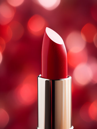 A stunning red lipstick is showcased in front of a blurred bokeh background, embodying elegance and style. Ideal for beauty promotions and makeup content.