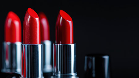 A visually striking close-up of glossy red lipsticks arranged attractively against a dark background. Ideal for beauty and cosmetic themes.