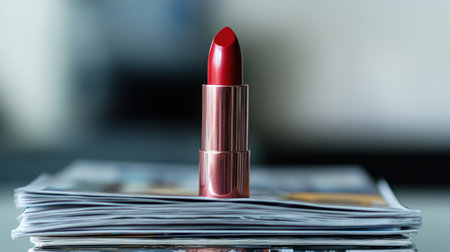 A stunning bright red lipstick stands elegantly on a stack of magazines, creating a chic and stylish composition perfect for beauty and makeup enthusiasts.