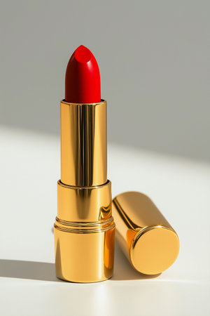 This elegant image showcases a red lipstick encased in a luxurious golden tube, highlighted against a soft, light background with well-defined shadows, exuding sophistication and style.