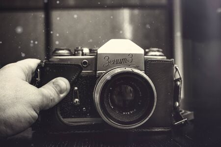 MOSCOW, RUSSIA - SEPTEMBER 28, 2019: Old vintage camera Zenit.
