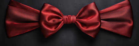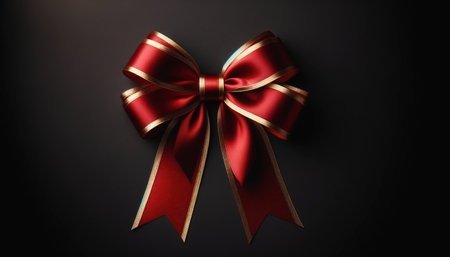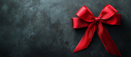 A vibrant red satin bow is elegantly placed on a dark textured surface, perfect for holiday gifts or decorations, creating a festive atmosphere for celebrations.
