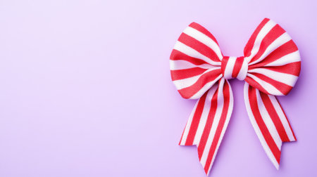 A vibrant red and white striped bow rests against a soft purple background, perfect for creative projects, decorations, or festive events. Ideal for visual appeal.