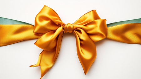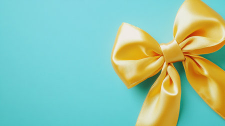 This image features an elegant yellow satin bow placed on a vibrant teal background, perfect for gift wrapping and decorations. Its smooth texture adds a touch of luxury.