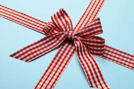 Checkered gift bow on blue background, close up