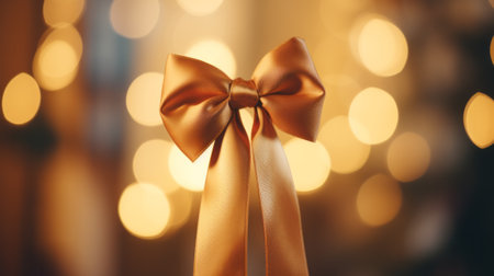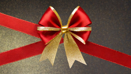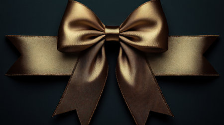 A golden ribbon bow on a dark textured background, ideal for festive d