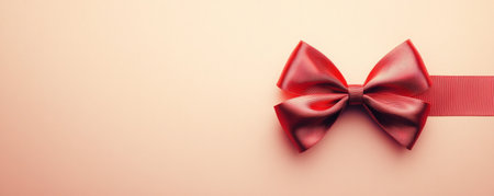 Red ribbon bow on light beige background, festive celebration concept
