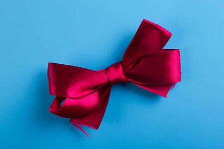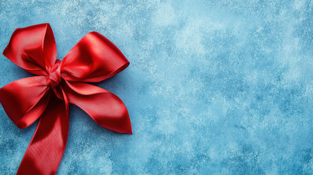 A close-up of a red satin ribbon gift box, placed on a blue background, perfect for holiday gift wrapping concepts with plenty of copy space.