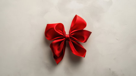A minimalist composition featuring a red satin bow, perfectly tied and lying flat on a white background, ideal for seasonal themes.