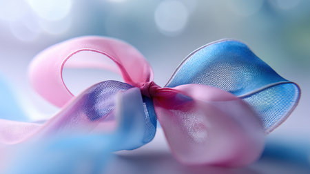 A beautiful pink and blue sheer ribbon bow set against a soft bokeh background, perfect for crafts, decorations, and enhancing romantic themes in any project.