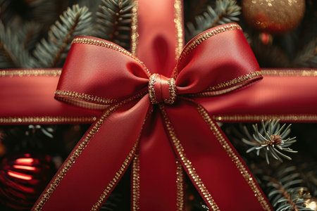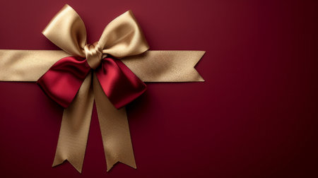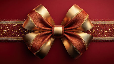 This stunning image features an elegant gold and red bow on a rich crimson background, ideal for adding a touch of luxury to festive decorations or gift wrapping.
