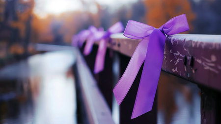 Purple ribbons tied to a park bridge.