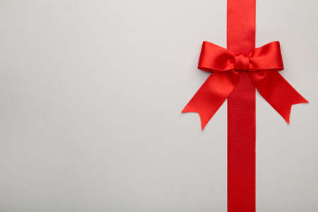 Red ribbon with bow with tails on gray background. Top view.