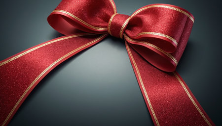 A close-up shot of a red glitter ribbon tied into a bow. The ribbon has a textured glitter surface and is edged with a thin gold trim. The bow is positioned in the upper right quadrant of the frame, with its loops and tails extending across the dark, subtly lit background. The lighting creates soft shadows and highlights, emphasizing the shimmer of the glitter.