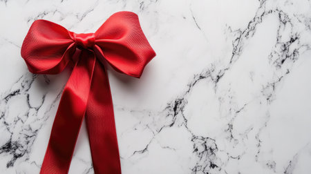 A vibrant red satin bow beautifully placed on a luxurious marble background, perfect for adding elegance to gifts or holiday decorations.