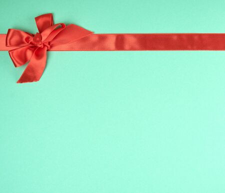stretched red silk ribbon and tied bow, green background, top view