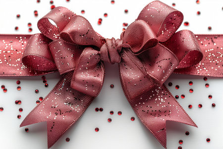 A festive rose gold ribbon bow adorned with glitter, set against a clean white surface with scattered red confetti.