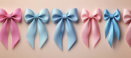 Five Graceful Satin Pink and Blue Gift Bows Neatly Arranged in a Row on a Soft Beige Background