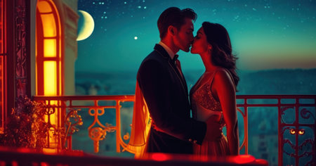 An AI generated illustration of a romantic couple poses against a dazzling lights for Valentine's day