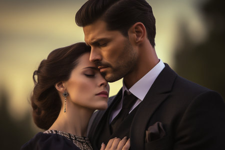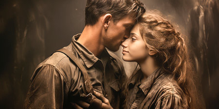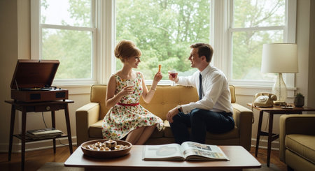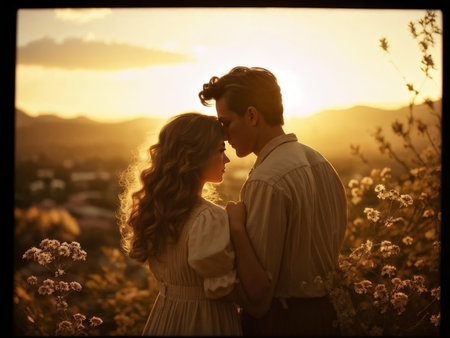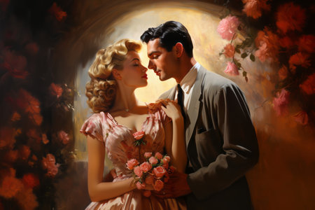 A vintage style illustration, a portrait of a couple deeply in love, surrounded by blooming flowers and soft sunlight. The couple is dressed in elegant attire from the 1950s. Generative Ai