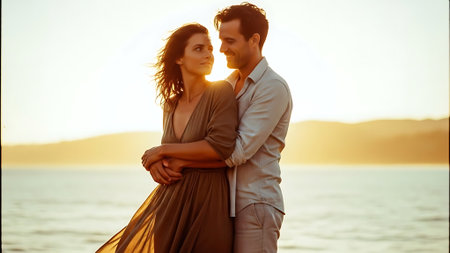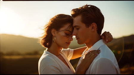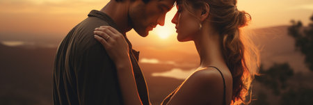 Close-up of a pair standing together, their features illuminated by the sun's embrace. AI generative.