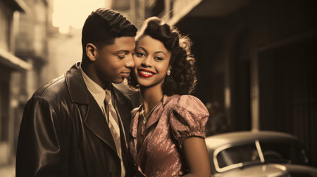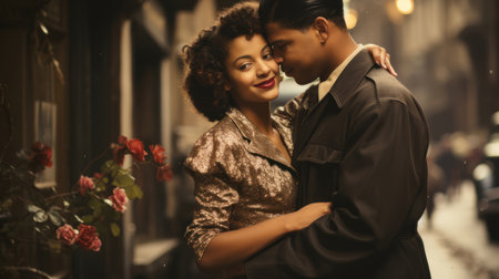 An affectionate African American couple embraces and kisses on a vintage style city street, surrounded by warm, romantic lighting and a soft ambiance.