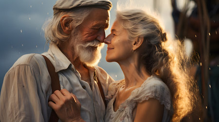 A heartwarming image of an elderly couple sharing a passionate kiss, showcasing their enduring love and happiness. (elderly couple, love, happy, senior, romance)