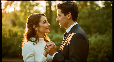A man and woman in formal attire hold hands and gaze into each other's eyes, surrounded by lush greenery and warm sunlight filtering through trees in the background.