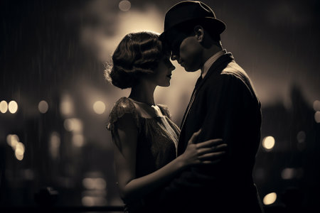 Smiling young couple embracing in black and white city romance generated by artificial intelligence