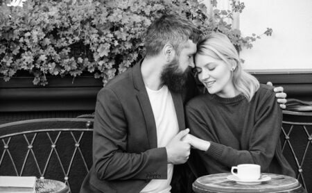 Life together. woman and man with beard relax in cafe. Brutal bearded hipster and girl drink coffee. Morning coffee. Couple in love on. First meet of girl and mature man. Doing everything together