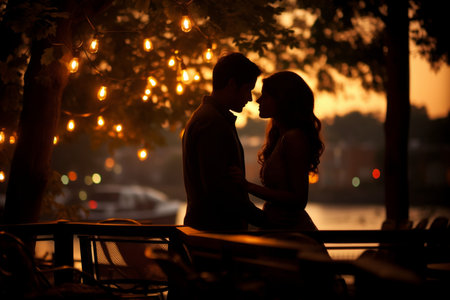 Romantic Couple Silhouette with Heart Bokeh in Warm Light