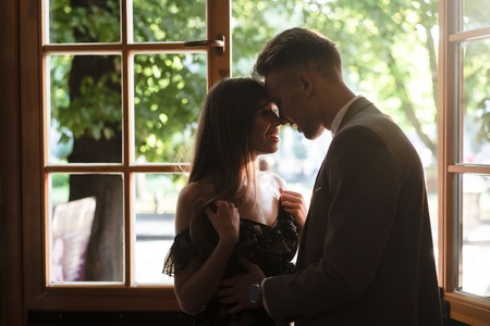 Portrait of a beautiful young couple in love embracing and smiling at each other on sunset background
