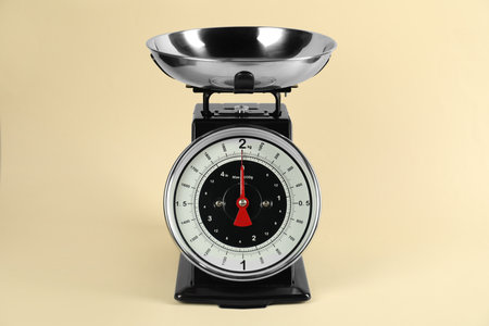Yellow old kitchen weight scales on yellow background with free space for text. Copy space. 3D rendering.