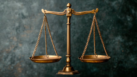 The golden scales of justice stand balanced, representing the ideals of fairness and equality in legal matters. Their intricate design showcases craftsmanship and attention to detail.