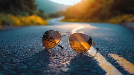 A stylish pair of sunglasses rests on a winding road, capturing the warm glow of sunset, symbolizing freedom and adventure in a serene natural setting.