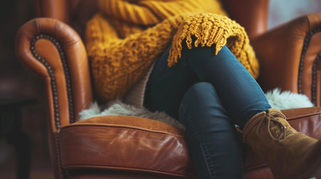 Closeup of legs of young woman wearing warm sweater sitting in armchair