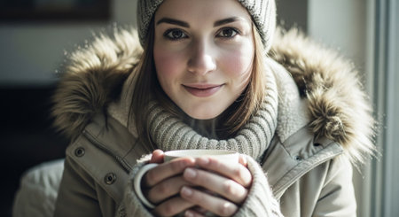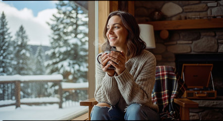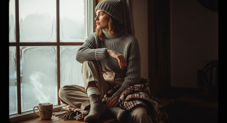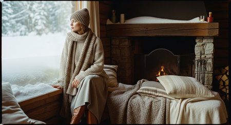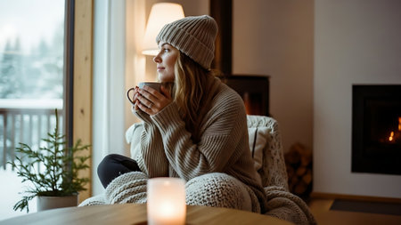 A cozy indoor scene featuring a woman sitting by a window with a cup, wearing a knitted hat and sweater, surrounded by winter decor, snow visible outside