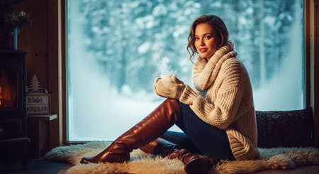 A peaceful winter scene of a woman sitting by a large window, wrapped in a patterned knit sweater as she enjoys a steaming mug of tea. Soft lamplight and the snowy landscape outside create a warm, cozy, and comforting atmosphere. Ideal for themes of winter relaxation, hygge lifestyle, self-care, comfort, home warmth, and seasonal mood.