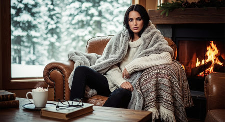 A woman sitting in a cozy chair by a fireplace, holding a mug and looking out the window, surrounded by winter scenery