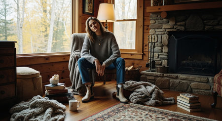 A cozy indoor scene featuring a person holding a steaming mug, sitting on a sofa with knitted sweater and warm socks, surrounded by books and a candle, with soft lighting and a window view