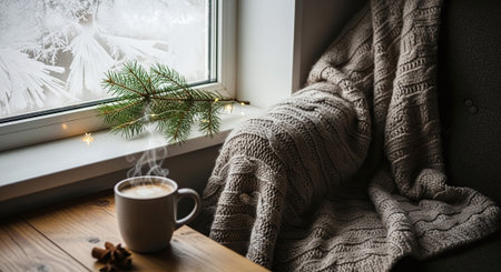 A cozy scene featuring a steaming cup of coffee on a wooden table next to a knitted blanket draped over a chair, with a pine branch and soft winter light coming through a window