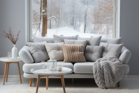 Cozy living room interior with sofa, coffee cup, book and knitted blanket