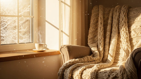 A close-up shot focuses on a plush armchair generously draped with a thick, cable-knit blanket. Sunlight streams through a nearby window, illuminating dust motes dancing in the air and casting a warm glow on the textured fabric of the blanket and the chair. Outside the window, a soft snowfall is visible, creating a serene winter scene. A white ceramic mug, likely containing a hot beverage, rests on the windowsill, with a hint of steam rising, suggesting warmth and comfort. The overall mood...