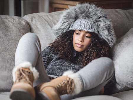 Close-up of a young woman with curly hair, wearing a gray knitted sweater and a furry winter hat, lying on a comfortable sofa with lined boots, enjoying a moment of introspection and rest.